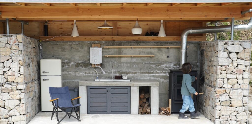 キッチン、薪ストーブ、BBQグリル、テーブル、チェア、ハンモック